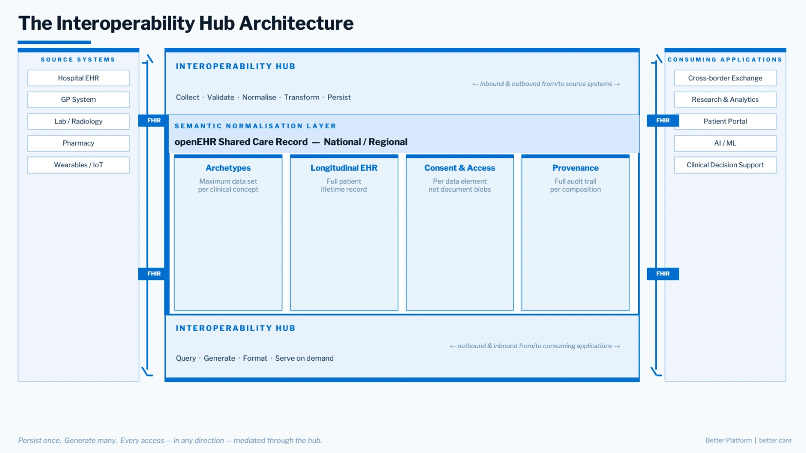 - The interoperability hub: collects, normalises, persists, and serves systems inbound and outbound at both ends. Source systems read from and write to it, consuming applications contribute as well as query, and all of it operates on the same governed semantic store.