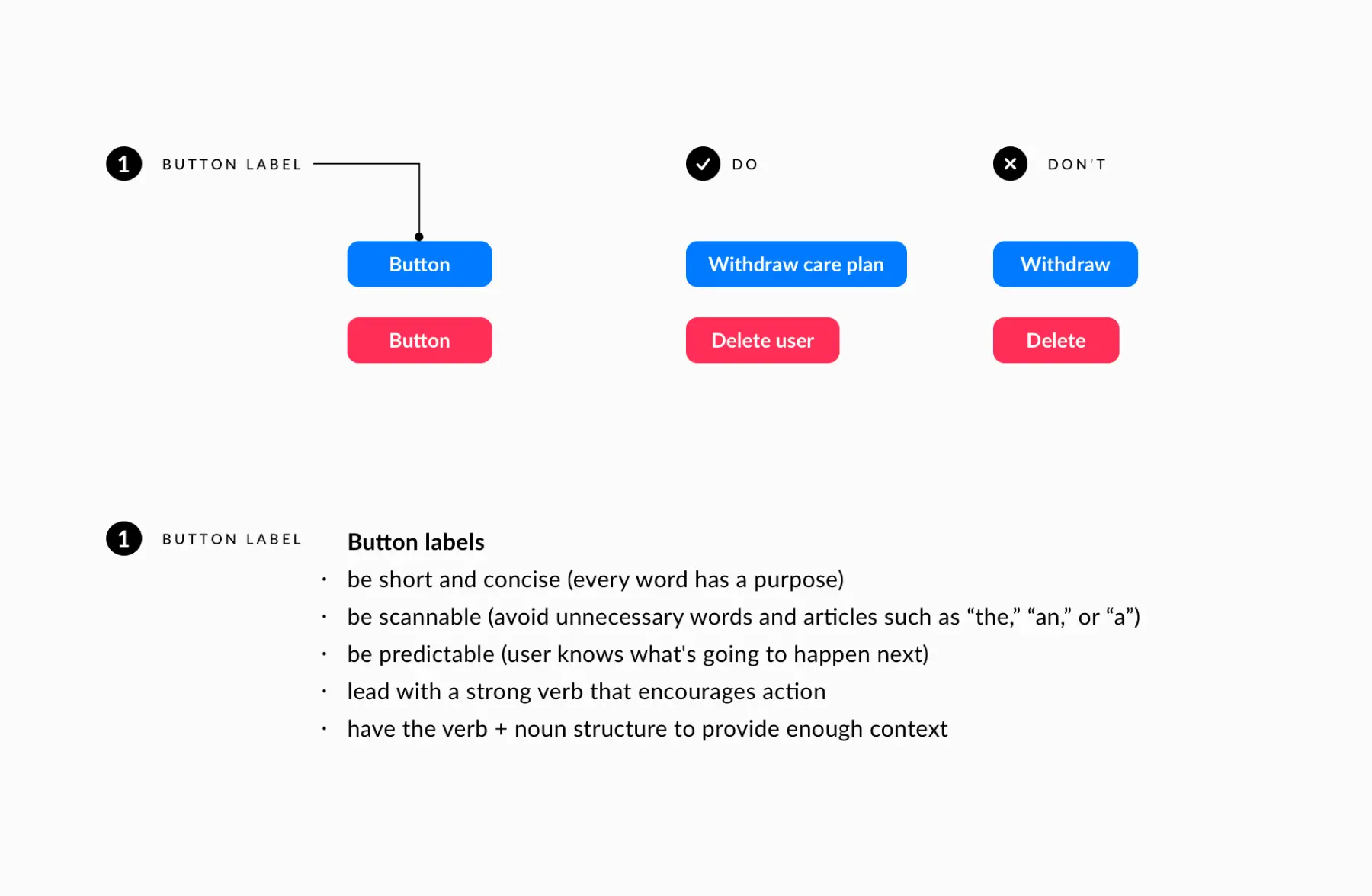 While we are laying down the ground rules, such as voice and tone, basic grammar, and writing style, we are also tackling content guidelines for components — if we’re already defining what a button looks like, we should also define what that button can say.