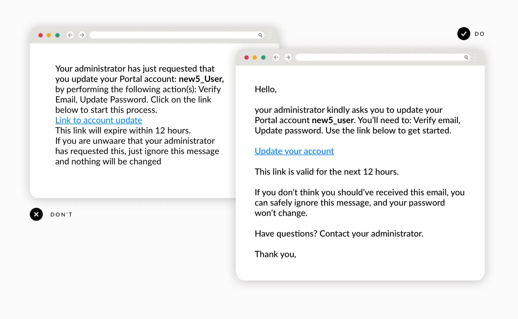 The difference in language when communicating with users. Clear instructions, structure with paragraphs, and a friendly tone provide a better experience for the user.
